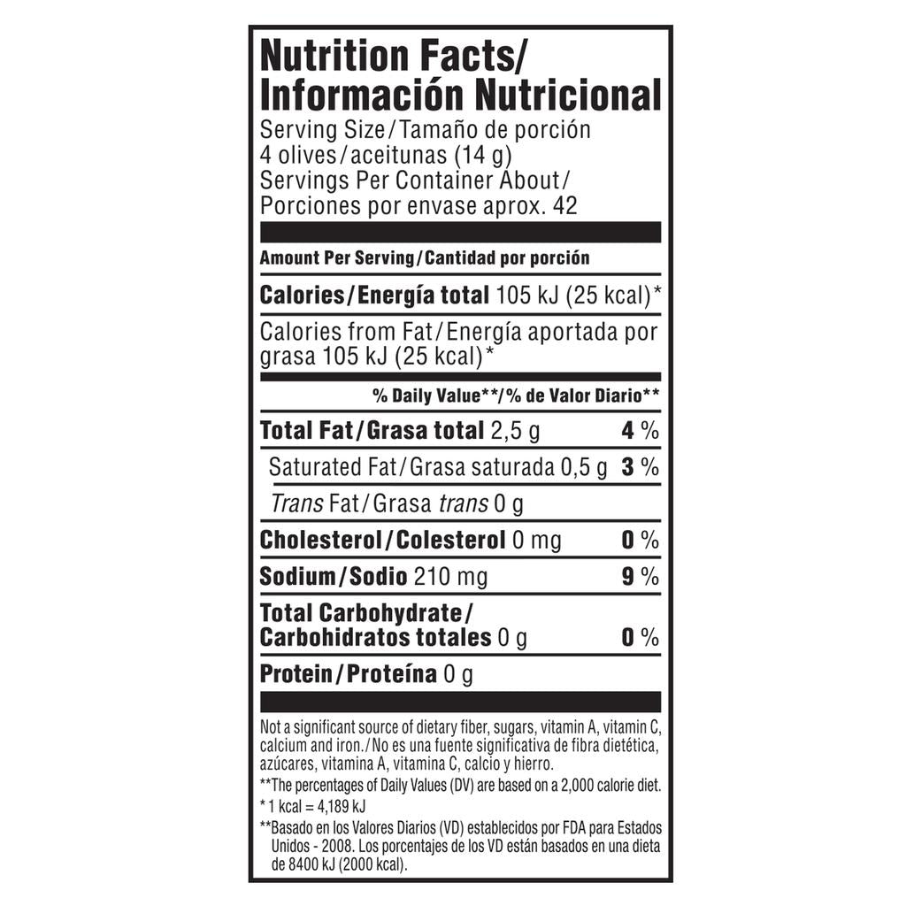 Ingredientes principales: Aceitunas verdes, pimiento, agua, sal, ácido cítrico, conservantes
